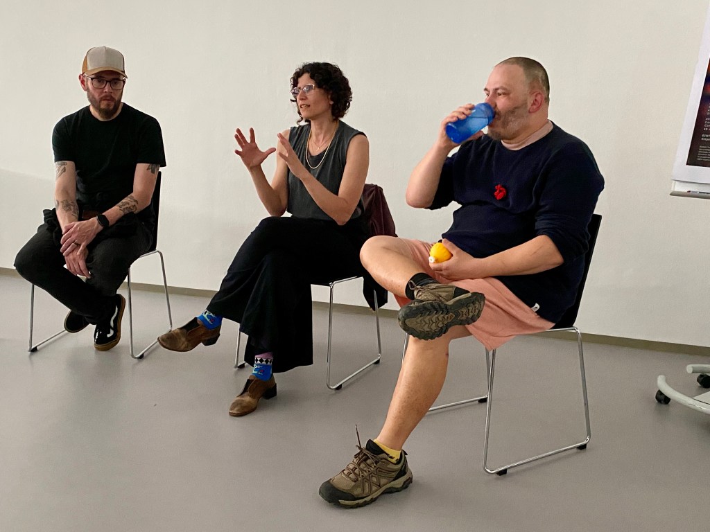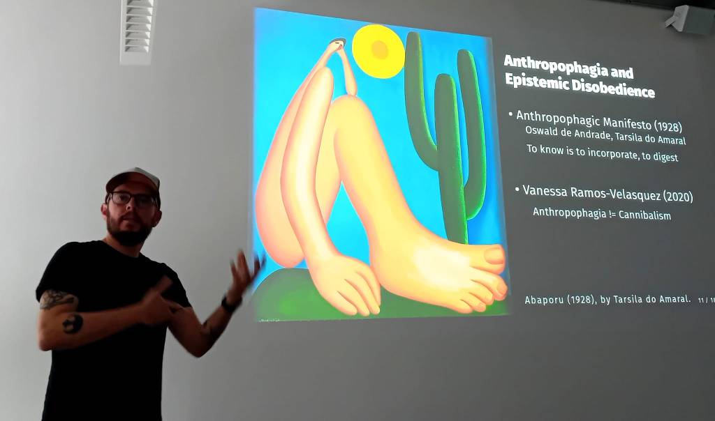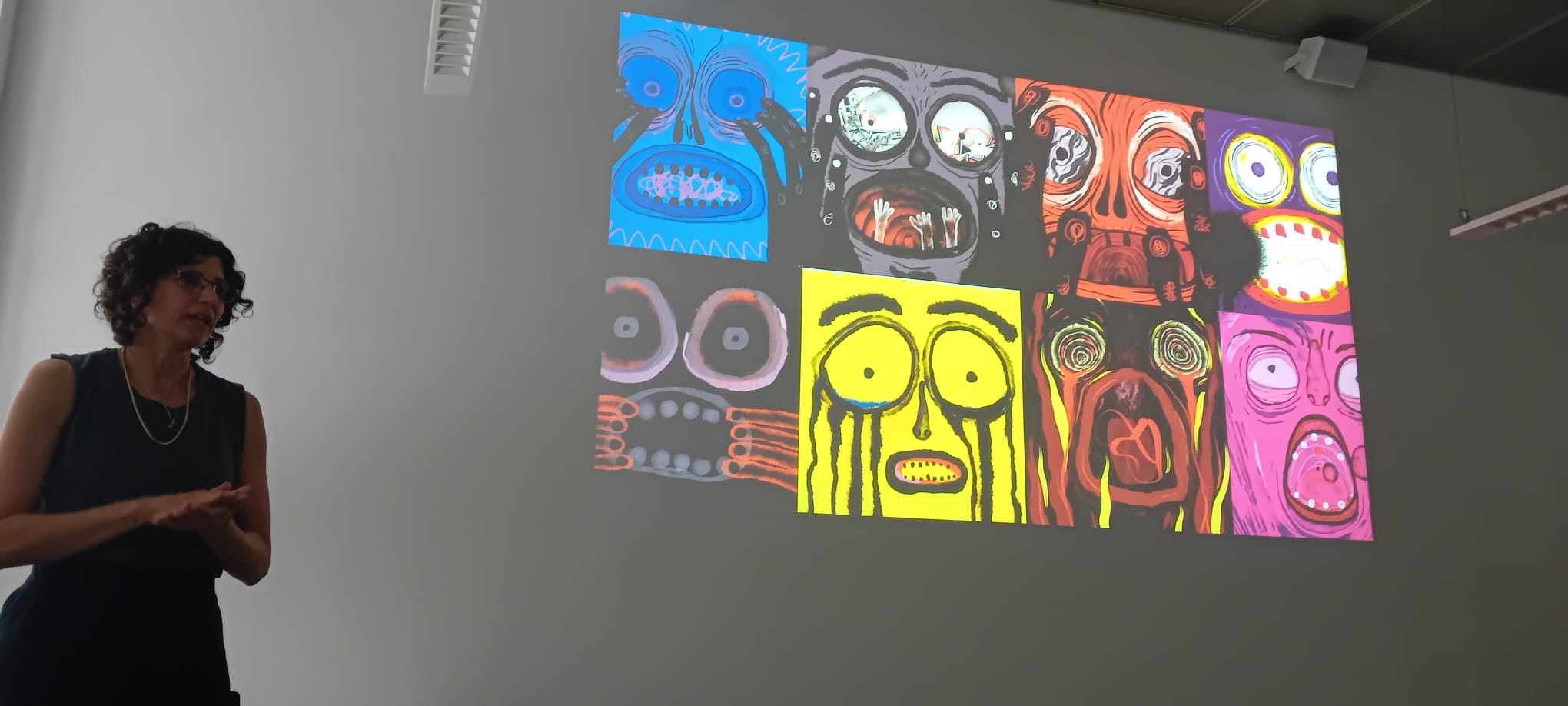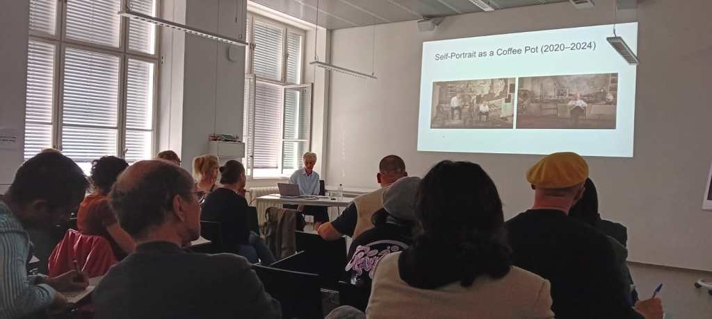 In Panel 2, Osi Wald, Virgilio Vasconcelos and Rares Augustin Craiut presented perspectives on the use of animation for shifting paradigms. OW showed animated loops of protest and quiet domestic moments created as a methodology for survival, persistence and resistance in a time of war. In an interesting discussion, the loop was variously considered as the therapeutic holding onto a comforting moment or perhaps a permanent imprisonment within a situation that never changes and you can’t break out of or perhaps even, when conceived of as a spiral or in three dimensions, it could be viewed from different angles. Does technology trap us into particular modes of thinking or worldviews? Can the core methods of animation resist this? In traditional frame-by-frame animation, we continually flip between views of the past and the present in order to make the future. VV connected this with the anthropophagia art movement of 1920s Brazil. In an attempt to decolonise their artworks, Brazilian artists of this period looked to the autophagy rituals of their ancestors as a metaphor. Condemned as cannibalism by the colonisers, these were not about eating other humans for food but a ritual to digest and assimilate the powers of noble enemies, a process of synthesis and reflection. These artists considered themselves to be collectively digesting and synthesising the art forms of their colonisers. Gen-AI was proposed as a form of commodified cannibalism in which the ideas of others are extracted and sold. Continuing the theme of digestion, we were all invited by RAC to eat chocolate as a form of sensory participation in his story from a childhood in communist Romania. With reference to Suzanne Buchan on pervasive animation, through the symbolic action of eating chocolate, animation was proposed as a form of material transformation and sensory, affective encounter.