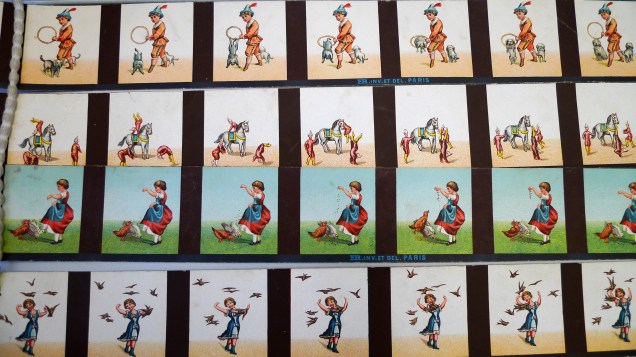 Looking at the paper strips from Émile Reynauld’s Praxinoscope (1889) there are also short ‘micro-narratives’: series of images that animate scenes from the circus – tightrope walking, juggling knives or weights, acrobatics with horses or dogs; or scenes from children’s play – blowing bubbles, skipping, a girl fishing, a baby eating, a fancy cat plays double bass; and even scenes from everyday work, leisure and sports – swimming, horse riding, dancing, feeding chickens, pumping water, sawing and cooking meat on a spit. All of these sequences of images capture bodies and matter in motion through illustration, before the cinema had even been invented. They do not take the form of stories, but are more like circus acts or fairground attractions.