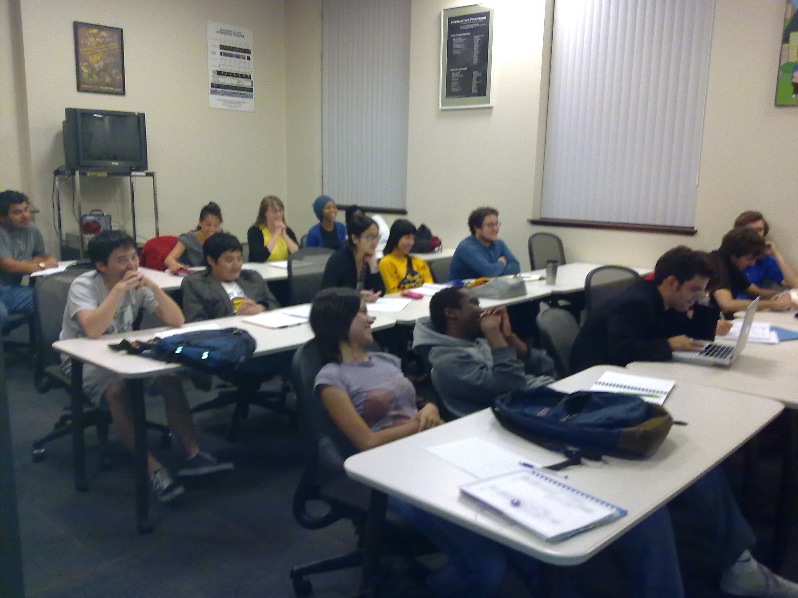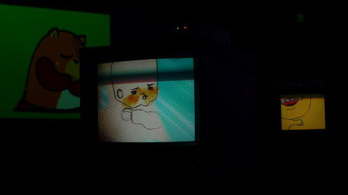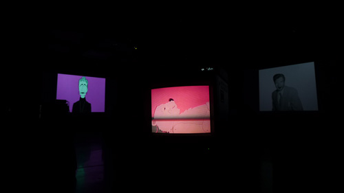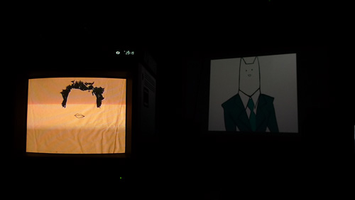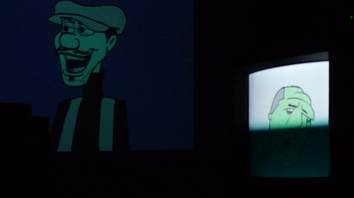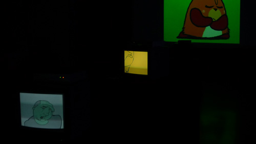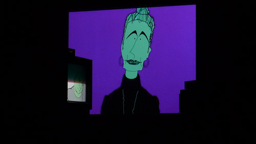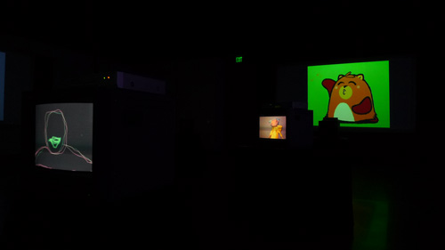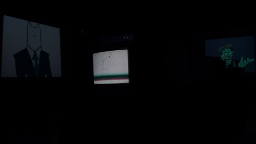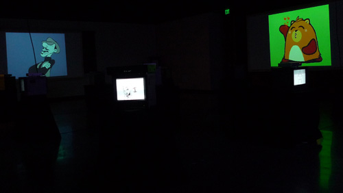 Finally, here is a video of the first version of the installation in the USC Cinematic Arts Gallery. It’s always quite hard to document video installations because of the light levels, but this gives an overall impression of the space, the different languages and accents spoken by the animated characters and of the experience of moving around the video monitors and wall projections. ‘It’s like being in a really noisy party’, said one of the attendees at the private view.