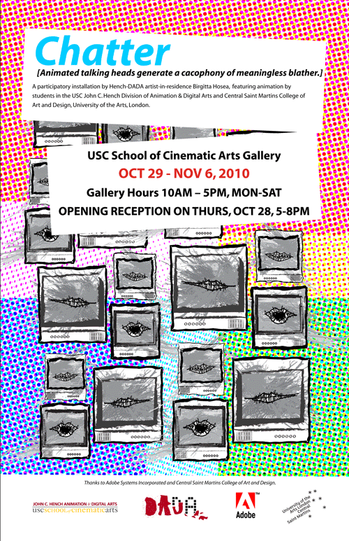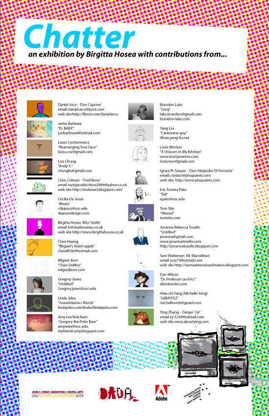 Animation students from USC and Central Saint Martins College of Art and Design are invited to contribute a short piece of animation featuring an animated talking head to the Chatter installation. This doesn’t have to be created especially for the project. It could be recycled from previous work that you have done.