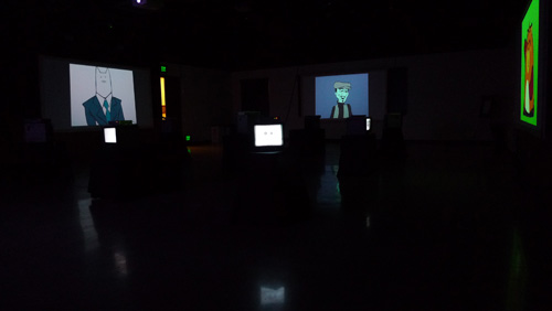 This evolving installation of animated talking heads investigates meaningless blather and the babble of crowds, reminiscent of conversations on Facebook or Twitter. Created by media artist, Birgitta Hosea, it includes crowd-sourced contributions from international artists and animators*.